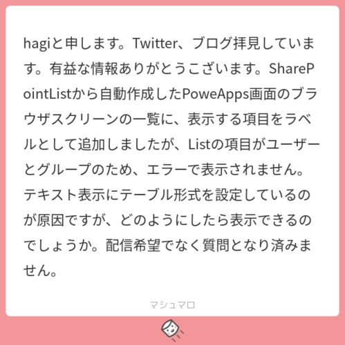 はじめに ユーザ情報を表示する ラベルにユーザ情報を表示させる DetailScreenと同じような表示にする おわりに はじめに 今回はこちらの質問に回答します。 ユーザ情報を表示する 今回は以下のようなリストを用意しました。 こちらの「Users」列が「ユーザ…