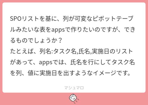 はじめに 完成イメージ Power Appsでピボットテーブルを表示させる 元となる考え アプリの構成 水平コンテナー Gallery GalleryのItems Gallery内のコントロール ラベル系の設定 区切り線の設定 アイコン フォームの設定 おわりに はじめに マシュマロにて以…