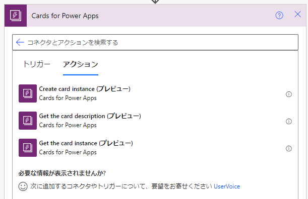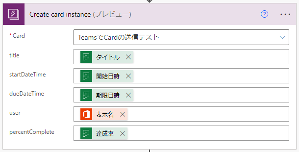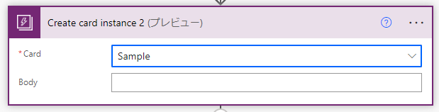 "Create card instance (プレビュー)"アクションでは、"Card"で作成したPower Apps Cardsを選択します。