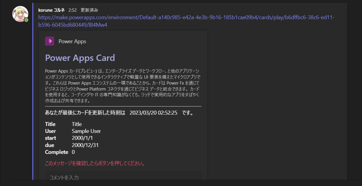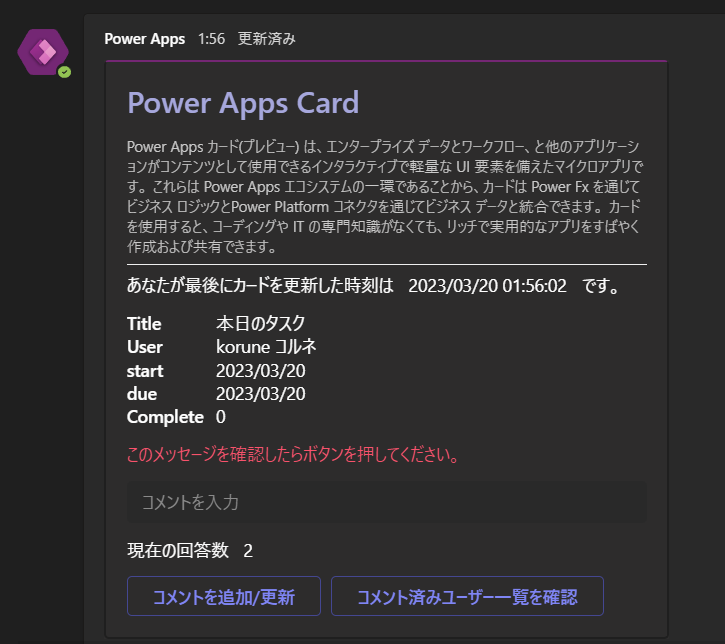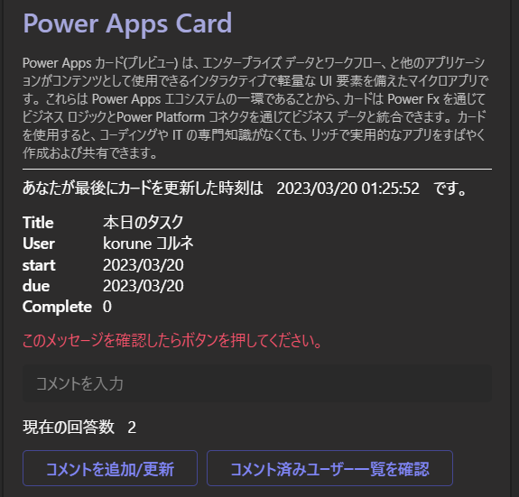 "コメントを追加/更新"を選択すると、テキスト入力で入力したコメント + 押したユーザーのユーザー名をmyUserTable