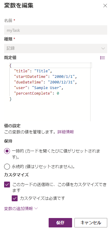 例えば先ほど作成したカードであれば、"myTask"で作成した変数は値をカスタマイズできるようにしていました。