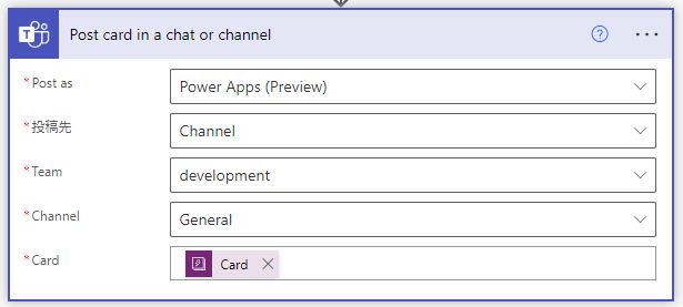 このアクションで作成されたPower Apps Cardsのインスタンス情報を用いてTeamsコネクタの"Post card in a chat or channel"アクションを利用してTeamsに送ります。