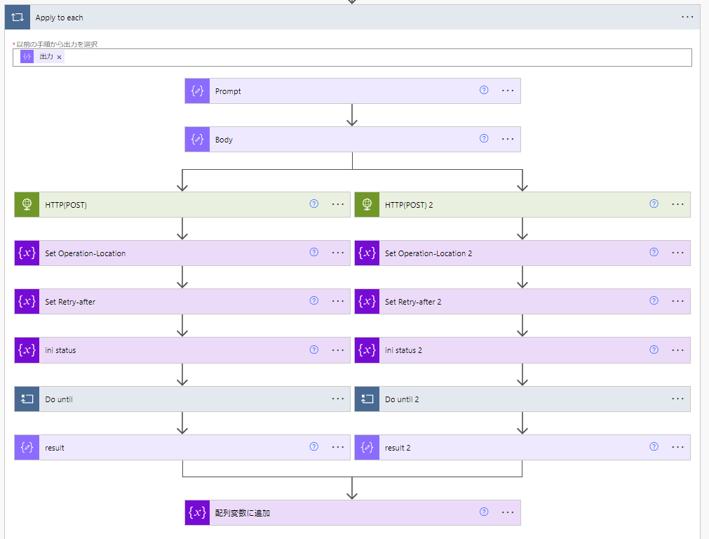 このテーブルをApply to eachで回し、その中でAzure OpenAI Serviceを呼び出しています。