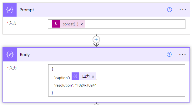 { "caption": @{outputs('Prompt')}, "resolution": "1024x1024" }