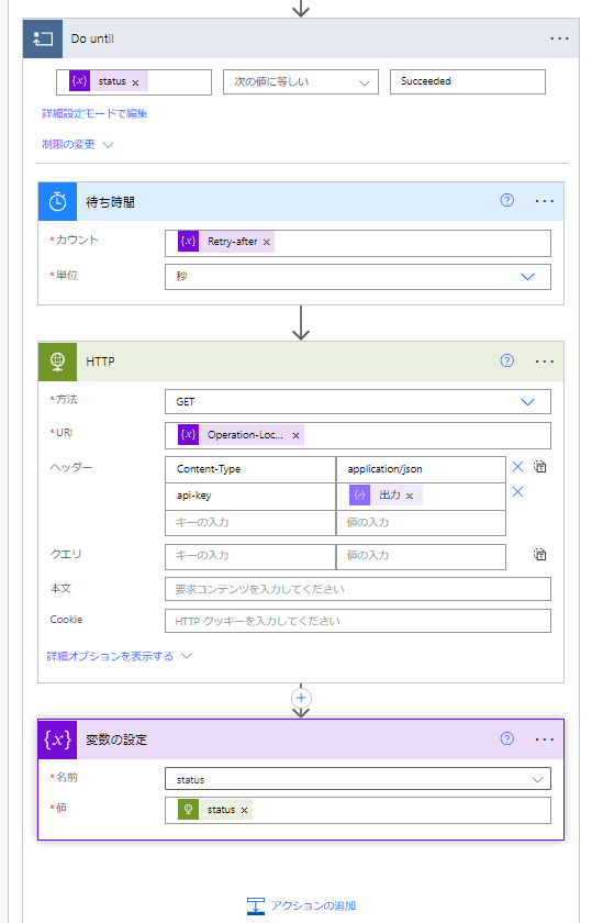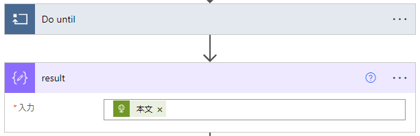 Do until内で実行されたアクションの実行結果をDo until外で参照すると、最後のループで実行されたアクションの実行結果が取得できますので、以下のように作成アクションで実行結果を取っています。(ここら辺の動作どこかでまたまとめますね)