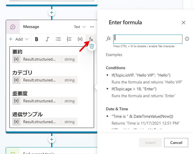 "Insert variable"を選択して変数の中をみてみるとこちらでも structedOutput が表示されていますので、これで出力結果を選択できます。